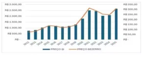 O Gráfico 2 evidencia que a valorização do bezerro costuma anteceder a alta da arroba do boi, sinalizando a redução da oferta futura de animais prontos para abate.