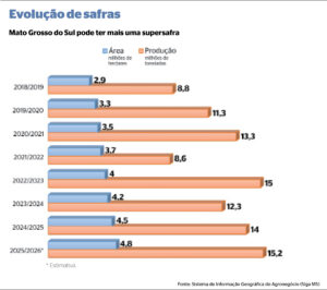 A projeção para a safra 2025/2026 é de produção de 15,2 milhões de toneladas, com produtividade média de 52,8 sacas por hectare. O volume estimado representaria um incremento de 2% em relação ao ciclo anterior.