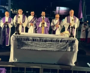 A celebração contou com a presença dos padres Junior, Benjamim, Leonardo e Marco Antônio, além dos diáconos Heitor e Pedro, que conduziram os fiéis em oração e reflexão.