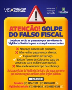 >>> A Prefeitura de Maracaju, por meio da Secretaria Municipal de Saúde e do Departamento de Vigilância Sanitária, emitiu um alerta oficial após comerciantes relatarem tentativas de extorsão praticadas por indivíduos que se passam por fiscais sanitários.